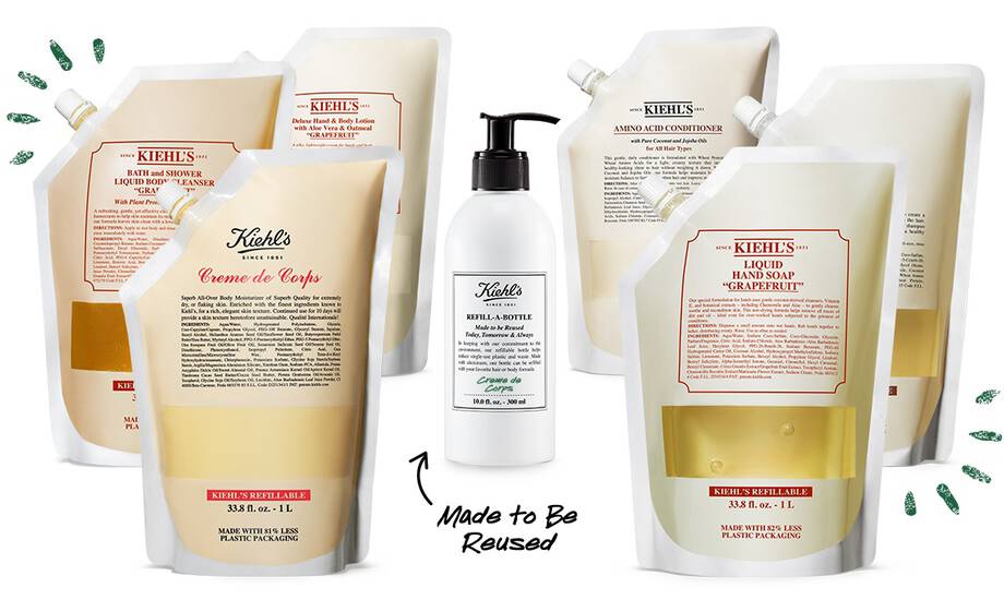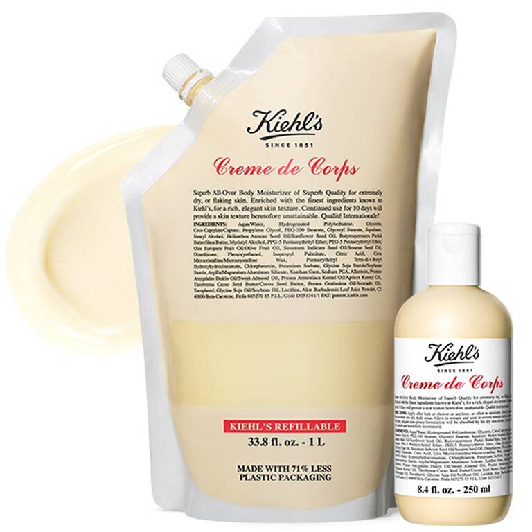 A promotional image for Kiehl's Creme de Corps featuring a large pouch of the product and a green circle highlighting that one pouch equals three bottles. The background includes a natural, outdoor theme with mountains.